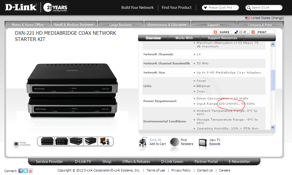 Well, one has to keep a promise, and you’re reading the blog post. In case you clicked the DXN-221 link above, you indeed will not find the voltage information, they changed the website. But since I’m not born yesterday, I made a screenshot before contacting D-Link.